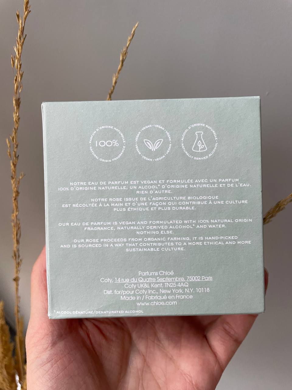 Веганская формула, натуральные отдушки и спирт, типа органическое масло розы. Рельефный стеклянный флакон состоит из переработанных материалов на 25%, а картонная упаковка – на 40%. Дизайн упаковки дополняет ленточка изумрудного оттенка из переработанных материалов, вдохновленная крепдешиновой блузкой Chloé с бантом. Состав действительно достаточно простой для сегмента классической парфюмерии. Я не смогла устоять, поверила громким заявлениям и решила попробовать 😁.