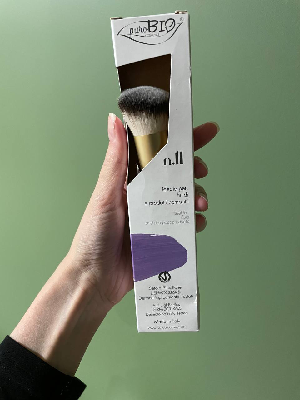 🌿 Отличная скошенная кисть #11 от Purobio. Заявлена для румян, бронзера, подходит для нанесения пудры, именно для этой цели и взяла. Увидела в видео у @maks_eco_beauty. Ей удобно наносить продукт. Мягкая, но при этом упругая, хорошо набита. Ворс синтетический.