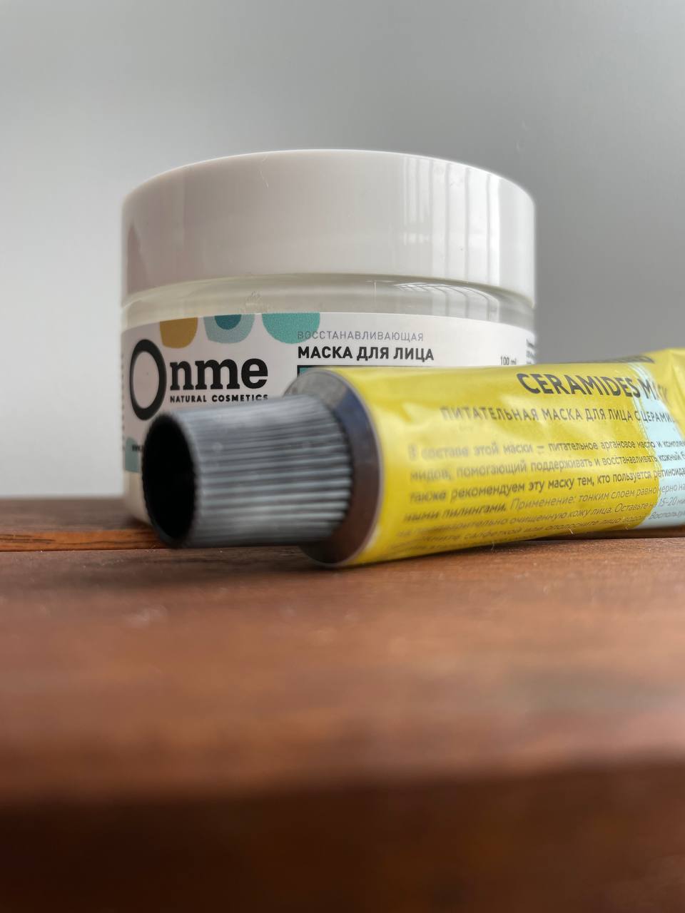На фото не зря эта маска представлена совместно с Питательной от Лабораториум с церамидами. Я думала, что она станет ей заменой, но не получилось. В целом маска очень даже не плохая, но от Лабораториум мне нравится больше. Onme выравнивает цвет лица, но мне не хватает увлажнения, хочется нанести что-то на кожу после смывания маски. Покраснения не вызвала, смывается легко. Купила теперь на пробу Питательную маску с энзимами тыквы от этого же бренда, пока не открывала.