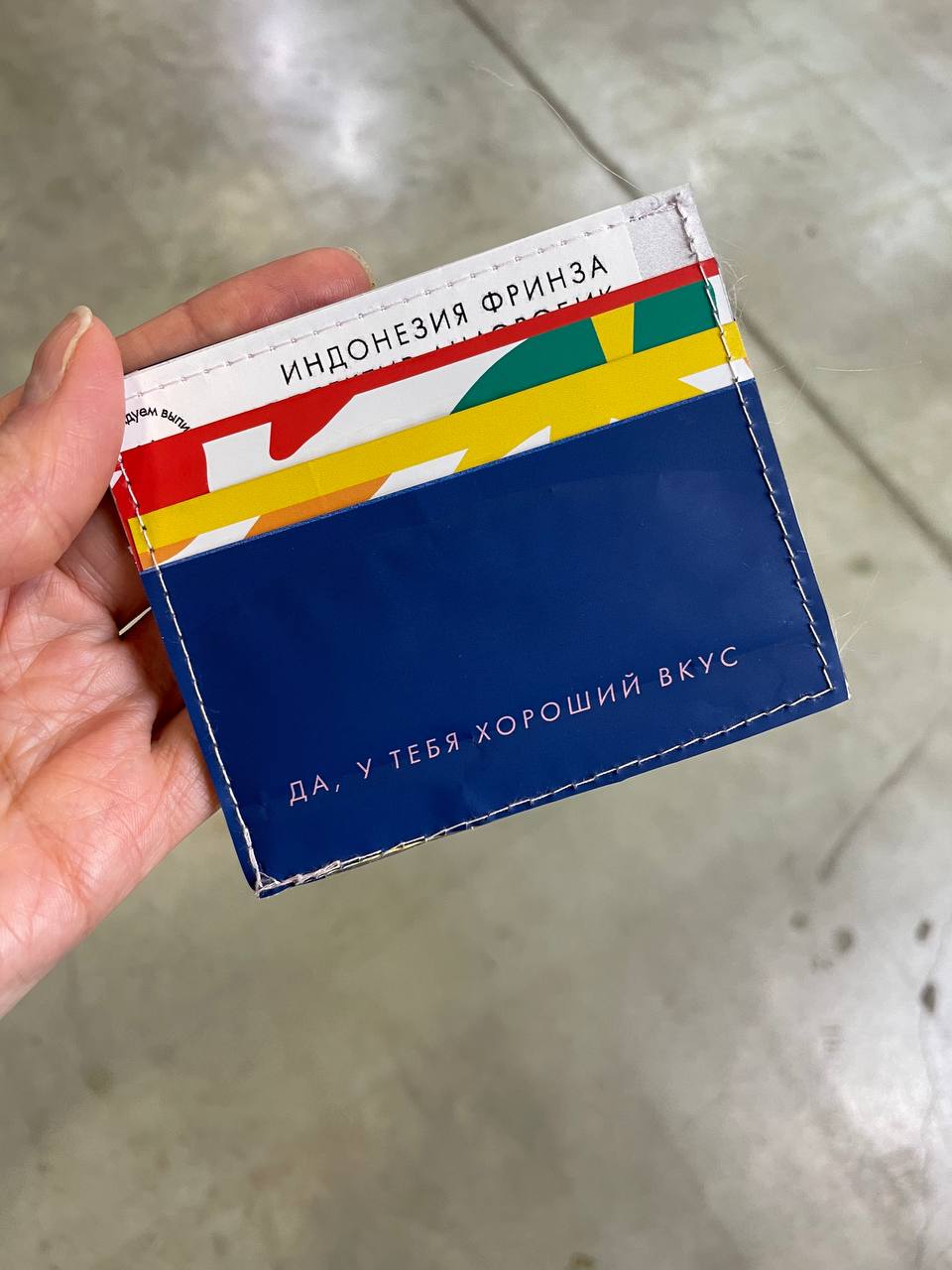 Была сегодня на кофейной выставке и купила там такой держатель для карт, сделанный из использованных кофейных пачек от обжарщика Ботаника. Пошит, конечно, так себе, но очень понравилась идея. Говорят, что прям долговечный.
