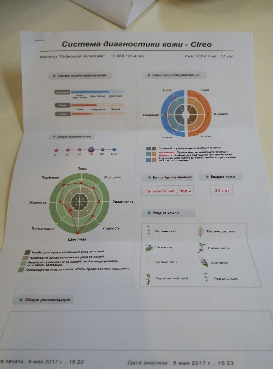 С собой вам дадут распечатки, текст написан автоматом, поэтому внимательно его можете не вычитывать потом, вам пригодятся графики и лучше сразу задавайте больше вопросов специалисту, так как на аппарате можно посмотреть глубину морщин (если они есть), глубину пор, вам расскажут про цвет лица, упругость кожи, пигментацию, увлажнение, жирность.